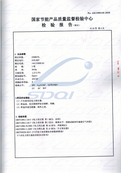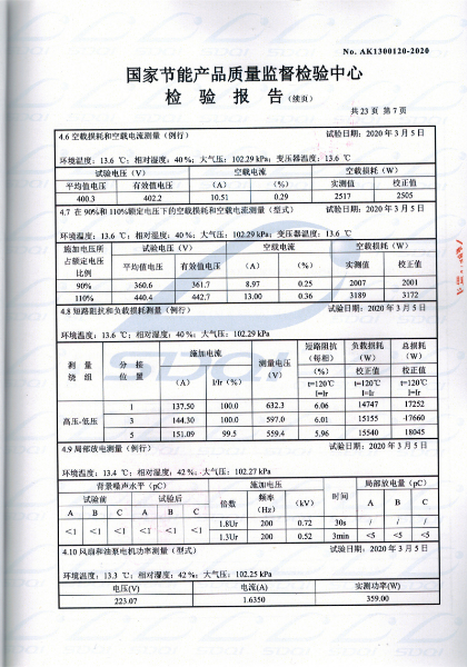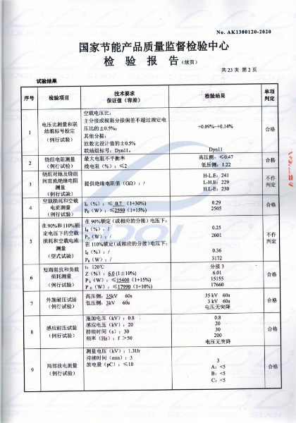 國家節(jié)能產(chǎn)品質量監(jiān)督檢驗中心 查詢編號:AK1300120 查詢備案證書號:GJJN-B-K2000120 批準日前:2020-03-11 公司名稱:山東中能變壓器制造有限公司